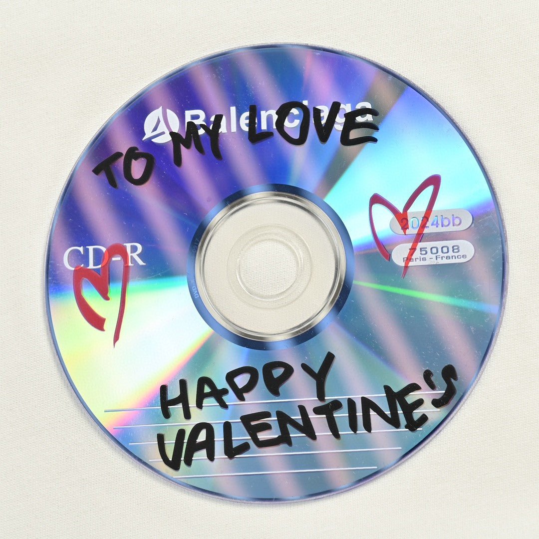 Esta camiseta Balenciaga presenta un gráfico único de CD con el texto "Happy Valentine" en el pecho. Confeccionada en algodón blanco de alta calidad, combina comodidad con un estilo divertido y distintivo. Perfecta para lucir un look casual y a la moda, esta camiseta es una prenda versátil que se adapta a cualquier armario.