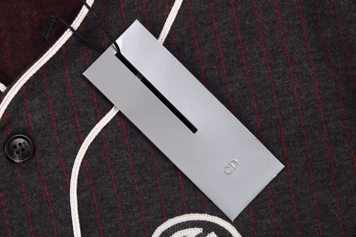 Camisa negra estilo béisbol con ribetes blancos y cierre frontal con botones. Luce el texto «Christian Dior Atelier Paris Avenue Montaigne» en negrita en el frente. Diseñada para un look deportivo y elegante.