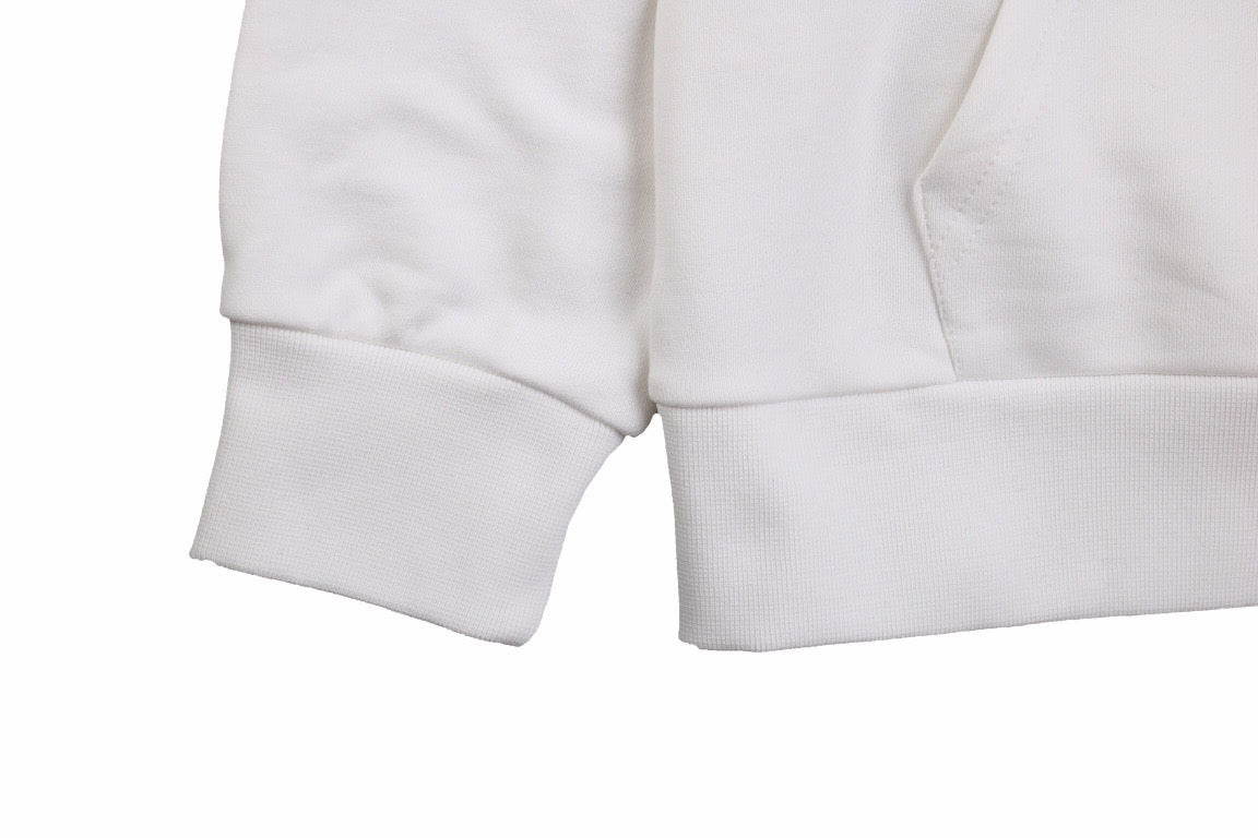 Esta sudadera Dior en color blanco presenta un llamativo logotipo "DIOR" en la parte delantera, con un estilo de pincelada audaz. Combina una estética casual con un toque artístico, perfecta para marcar la diferencia. Incluye una capucha con cordón ajustable y un bolsillo tipo canguro para mayor comodidad y practicidad.