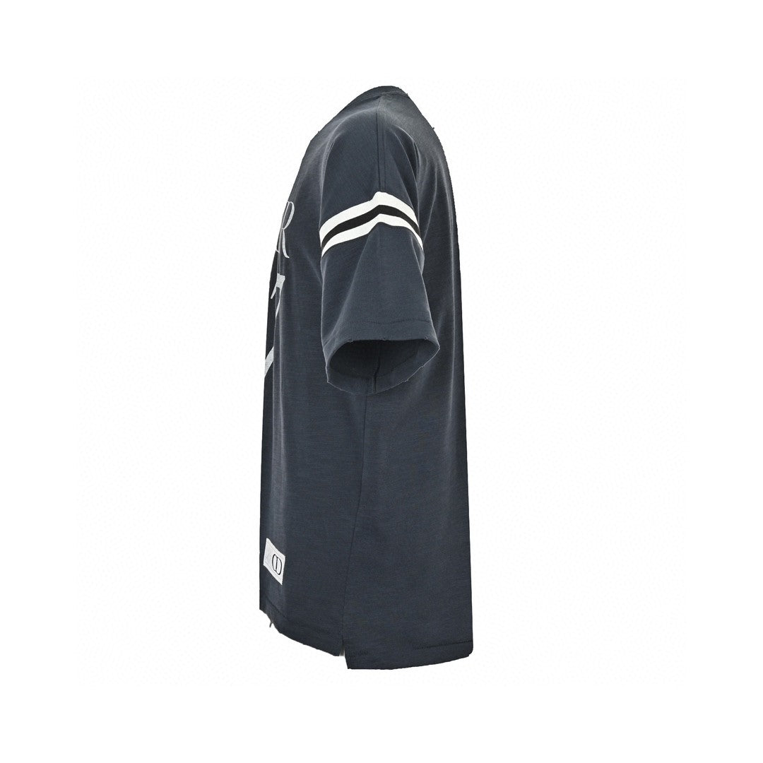 Esta camiseta de Dior luce un llamativo estampado «DIOR 47» en el pecho. Es de color gris oscuro con rayas blancas en las mangas. Lleva una pequeña etiqueta de Dior en el bajo. Su diseño informal le da un aire elegante y deportivo.