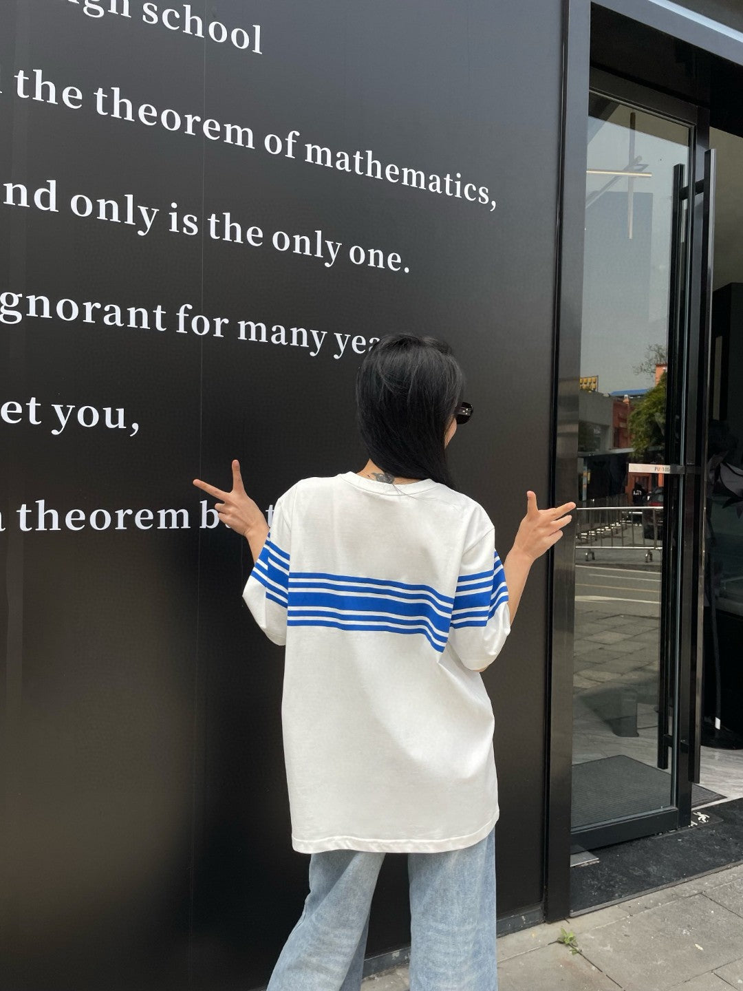 Esta camiseta de Gucci luce un elegante diseño de rayas azules en el pecho y las mangas, con el icónico logo "GG". La camiseta es principalmente blanca, de corte holgado, manga corta y cuello alto. Perfecta para añadir un toque de lujo a tu vestuario casual sin renunciar a la comodidad.