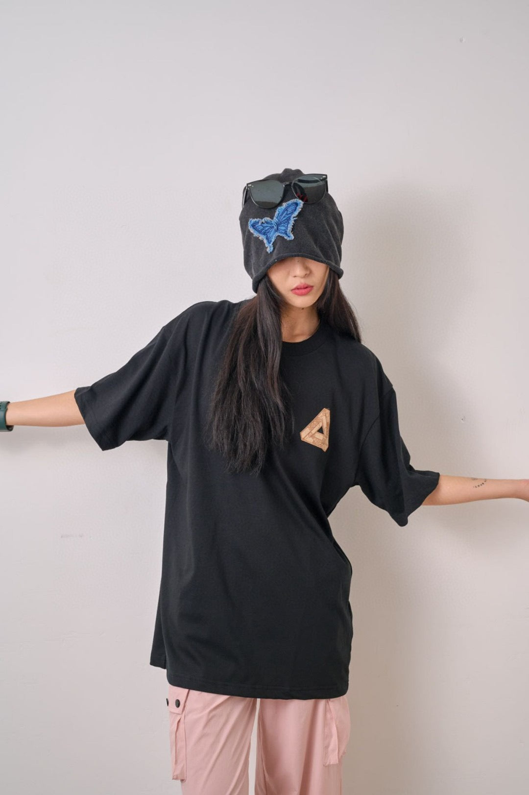 Esta camiseta de Gucci luce un discreto logo triangular en el pecho. Es principalmente negra, de corte holgado, manga corta y cuello alto. Perfecta para añadir un toque de lujo discreto a tu vestuario informal sin renunciar a la comodidad.