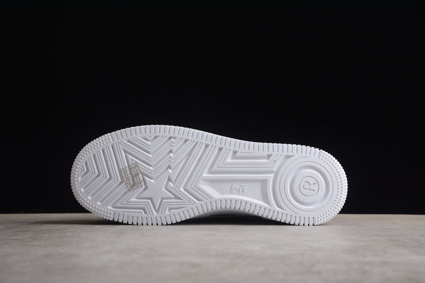 The thick rubber sole, in a classic white color, ensures excellent traction and durability. The sole features subtle BAPE branding, reinforcing the sneaker's unique appeal and connection to streetwear culture. The green "BAPE" logo on the midsole adds a final touch of branding, completing the sneaker's bold look.