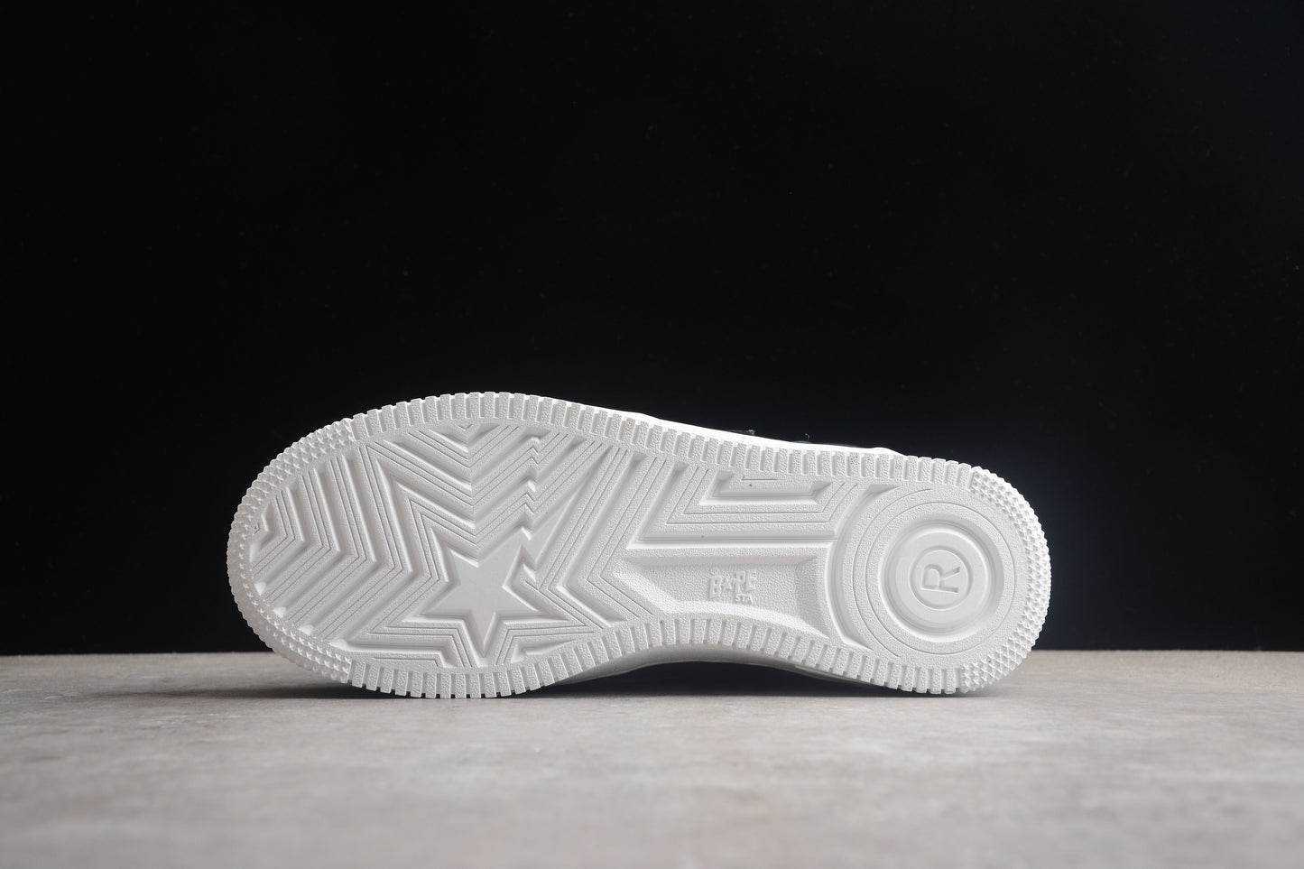 The sturdy rubber sole, in a contrasting white color, not only provides a striking contrast to the black upper but also ensures durability and reliable traction on various surfaces. The sole is embossed with the BAPE logo, adding an extra touch of authenticity and brand pride.