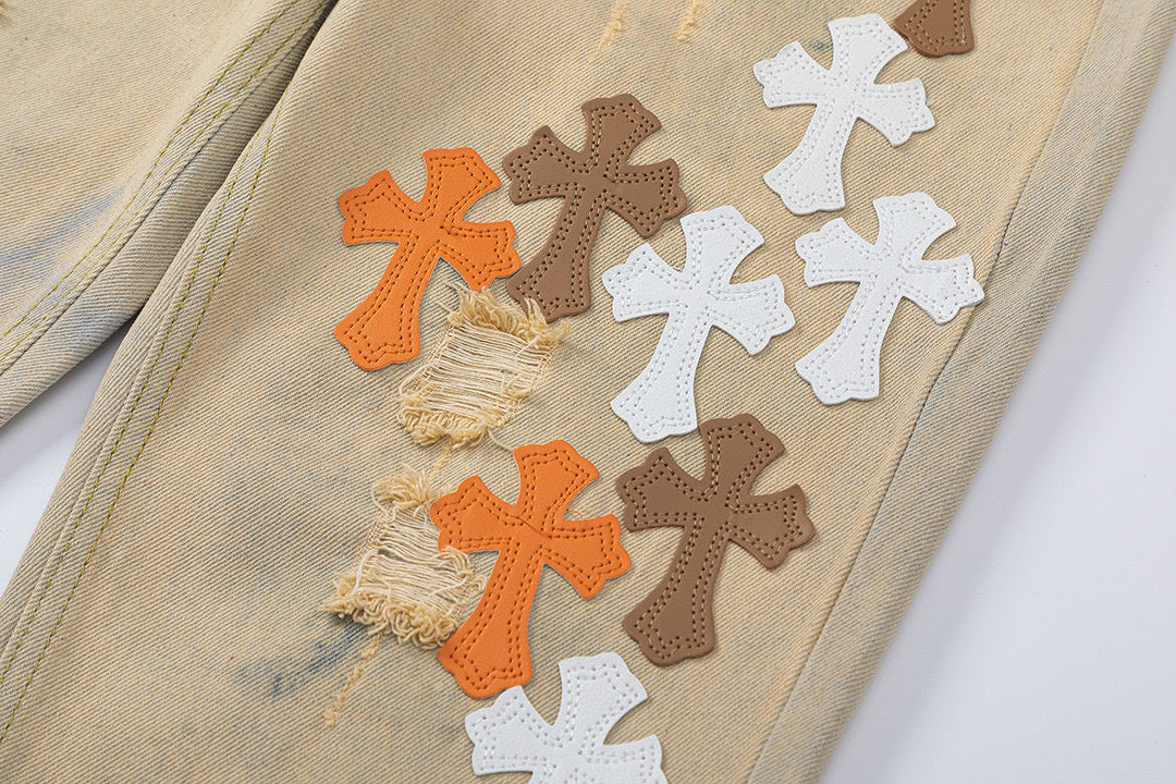 CHROME Hearts Brown Cross Patch Jeans Beige - Orange Unisex Streetwear Limited Edition