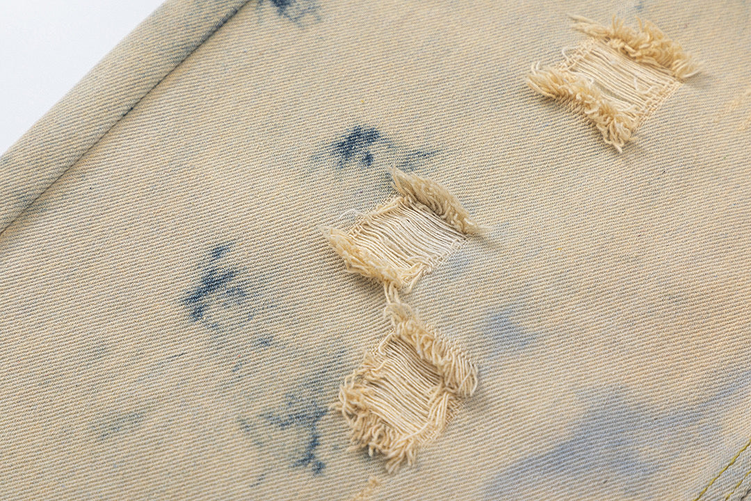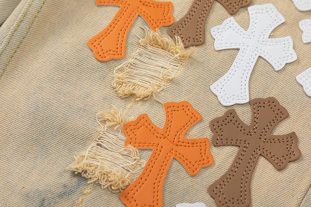 Color: Beige denim with warm-toned cross patches for a unique aesthetic