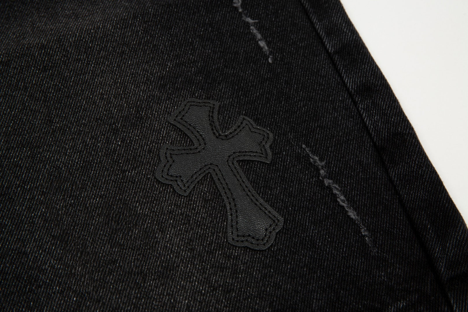 Color: Deep black denim with matching black cross patches for a sleek, low-key aesthetic