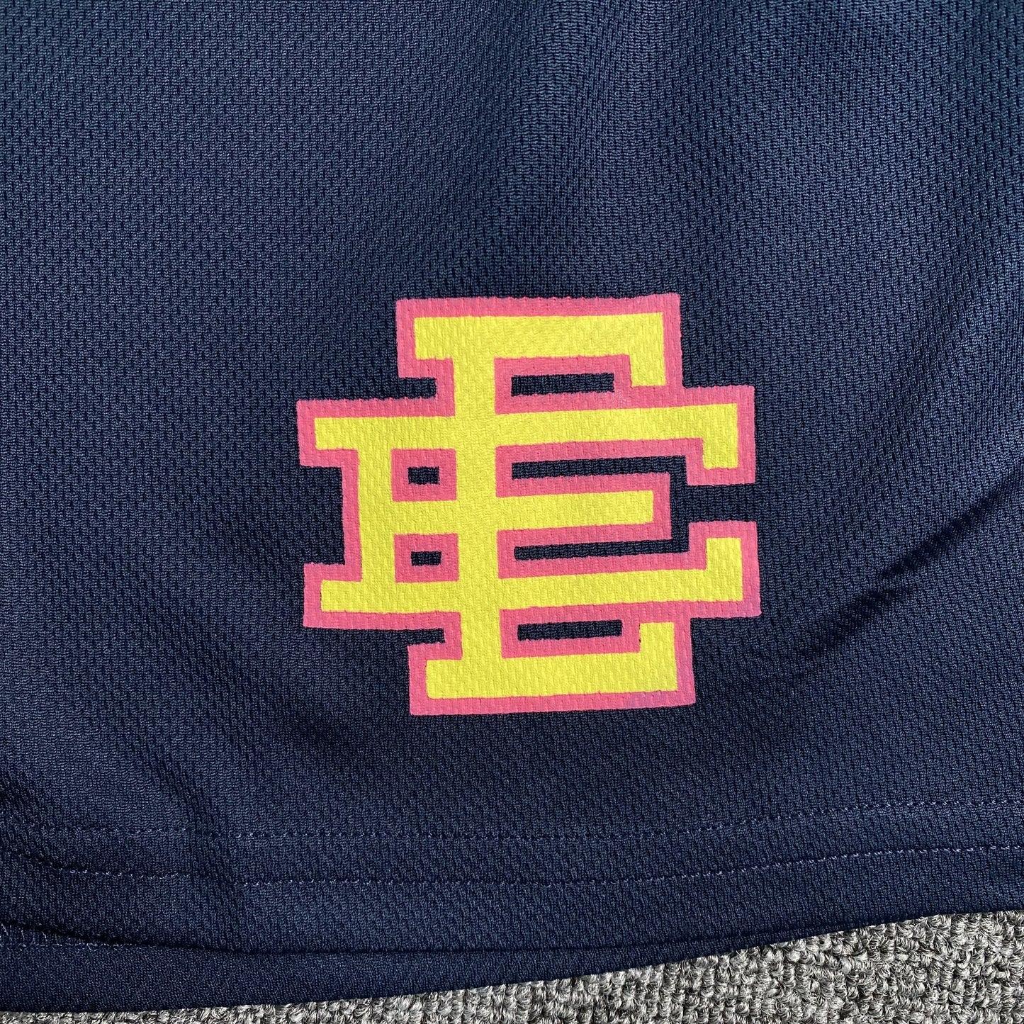 Featuring a deep navy base with mauve and yellow accents, these shorts showcase the signature EE logo, delivering a statement-making yet versatile look. The elastic waistband with an adjustable drawstring ensures a secure and customizable fit, making them ideal for lounging, basketball, or upgrading your streetwear game.