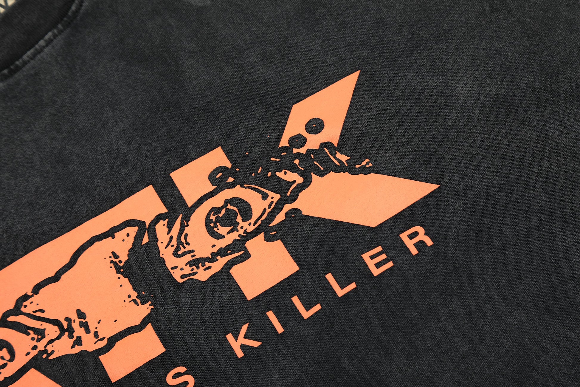 The "Gallery Dept. Art That Kills Dealers Killer T-Shirt" is a striking and bold statement piece. Crafted from high-quality cotton, this black t-shirt features a relaxed fit for maximum comfort. The front design showcases the "ATK Dealers Killer" text in an eye-catching orange color, accented by intricate, stylized graphics that add a unique touch to the overall look.