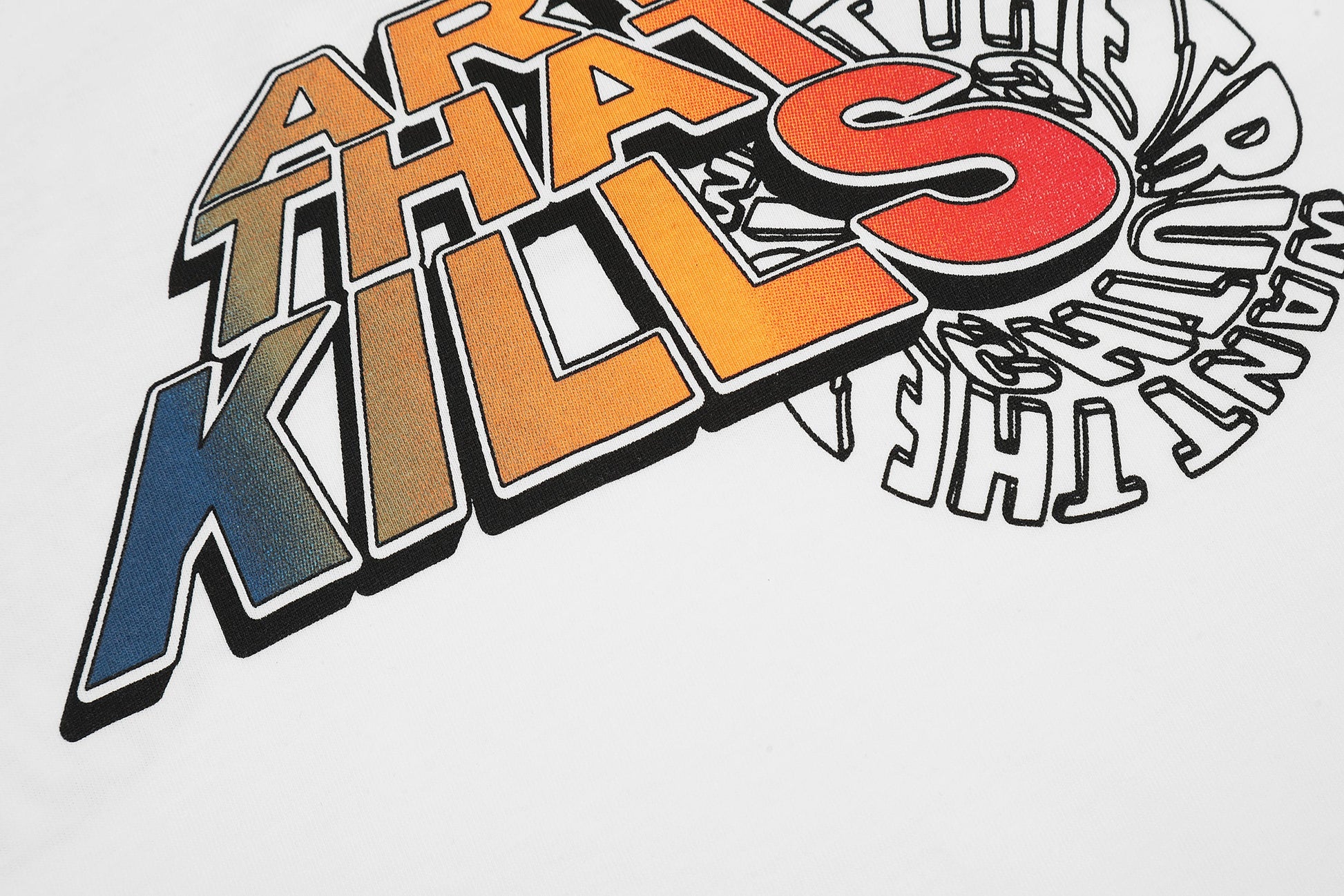 Introducing the Gallery Dept. "Art That Kills" Tee, a bold statement piece for your casual wardrobe. This white t-shirt features a dynamic graphic on both the front and back, showcasing the phrase "Art That Kills" in a vibrant, multi-colored design. Accompanying the text is an intricate circular pattern, adding depth and visual interest to the overall look.