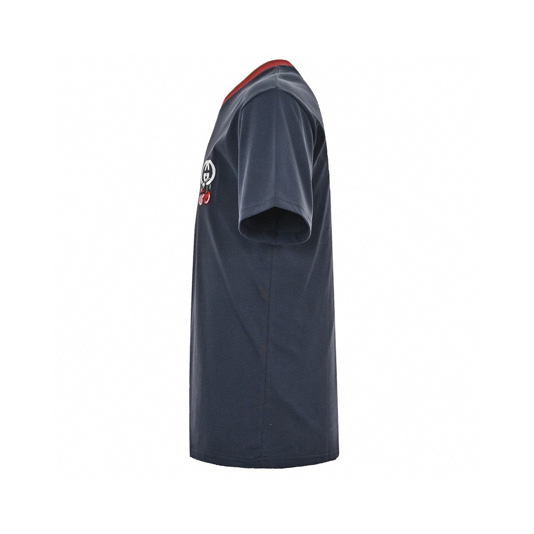 This Gucci t-shirt in navy features a small, playful cherry graphic intertwined with the iconic Gucci logo on the chest. The design is enhanced by a contrasting red collar, adding a touch of fun and elegance to your casual wardrobe.