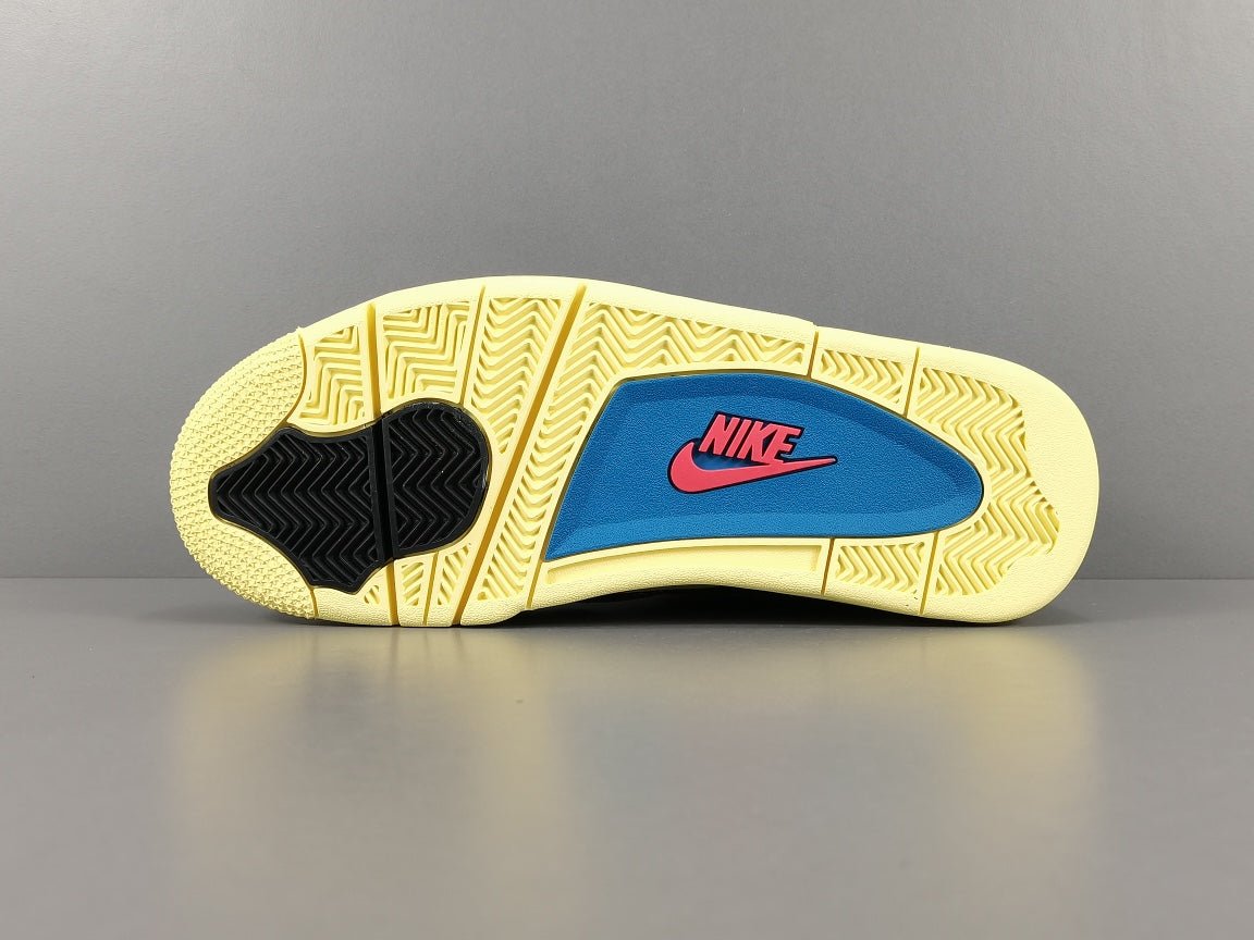 The Jordan 4 x Union Off Noir is completed with a durable rubber outsole, delivering excellent traction and grip on various surfaces. The attention to detail is evident throughout, with co-branded Union and Jumpman logos adorning the shoe, reflecting the collaborative nature of this release.