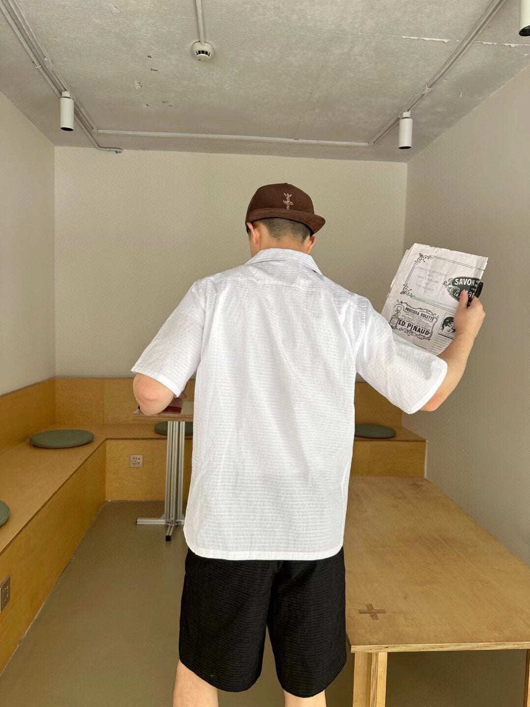 White short-sleeve button-up shirt with a subtle checkered pattern. Features a front pocket and classic collar. Designed for a sleek and minimalist style.